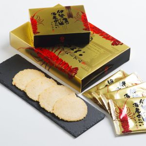 豪華な金のパッケージに引けを取らない内容のお煎餅には、伊勢海老まるごとパウダーを使用しており、 香ばしい海老の香り、そしてカリっとした食感が特徴です。